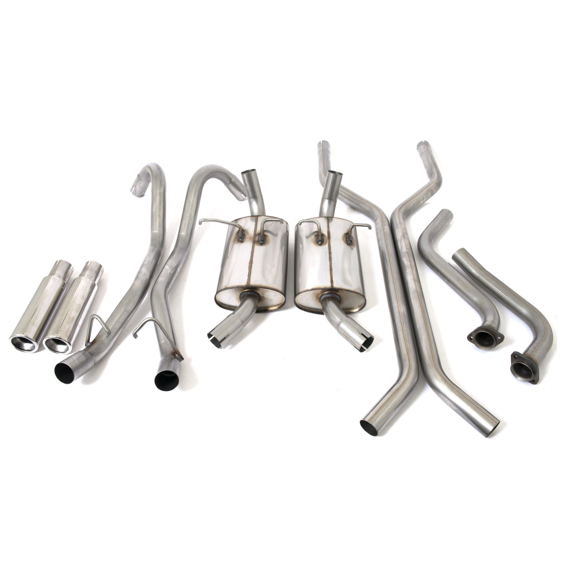 This “manifold back” has 0 silencers and bolts to the stock cast manifolds on the Cologne engine. It features a laser cut mild steel 10mm flanges. It has been constructed using 2″/50.8mm stainless steel tubing.